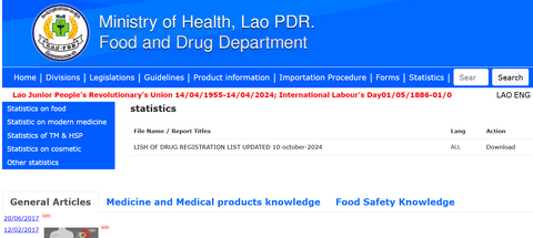 3,老挝药品,老挝专利期仿制药在2015年后才开始发展的,至今才十年时间,以下是老挝药品批文查询链接http://www.fdd.gov.la/content_en.php?contID=51,老挝药监局本着老挝人做事拖拉的性格,药监局批文数据也是一个月才更新一次,有时候两三个月才更新一次,本文编辑于2024年12月30日,药监局网站上一次更新是2024年10月10日,快3个月没有更新。