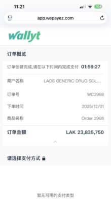 还有手机下单时候发现没有支付选项,这里是因为微信支付不支持手机浏览器唤醒,所以需要把这个付款页面链接复制到微信打开就可以出现付款选项了,就是下面这个浏览器可以看到的页面。结算货币是老挝币。