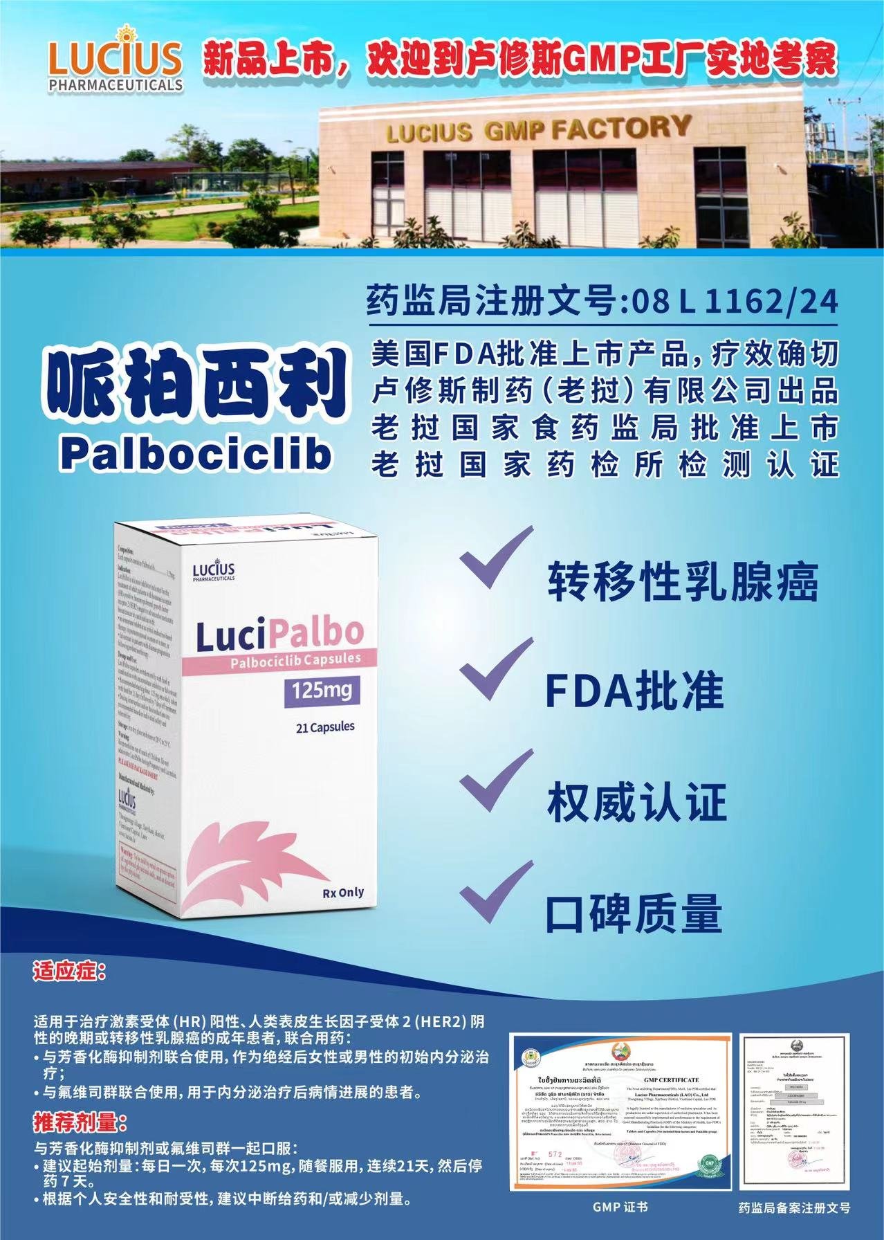 LuciPalbo是一种激酶抑制剂,用于治疗激素受体(HR)阳性、人表皮生长因子受体2(HER2)阴性的晚期或转移性乳腺癌的成年患者,并结合: