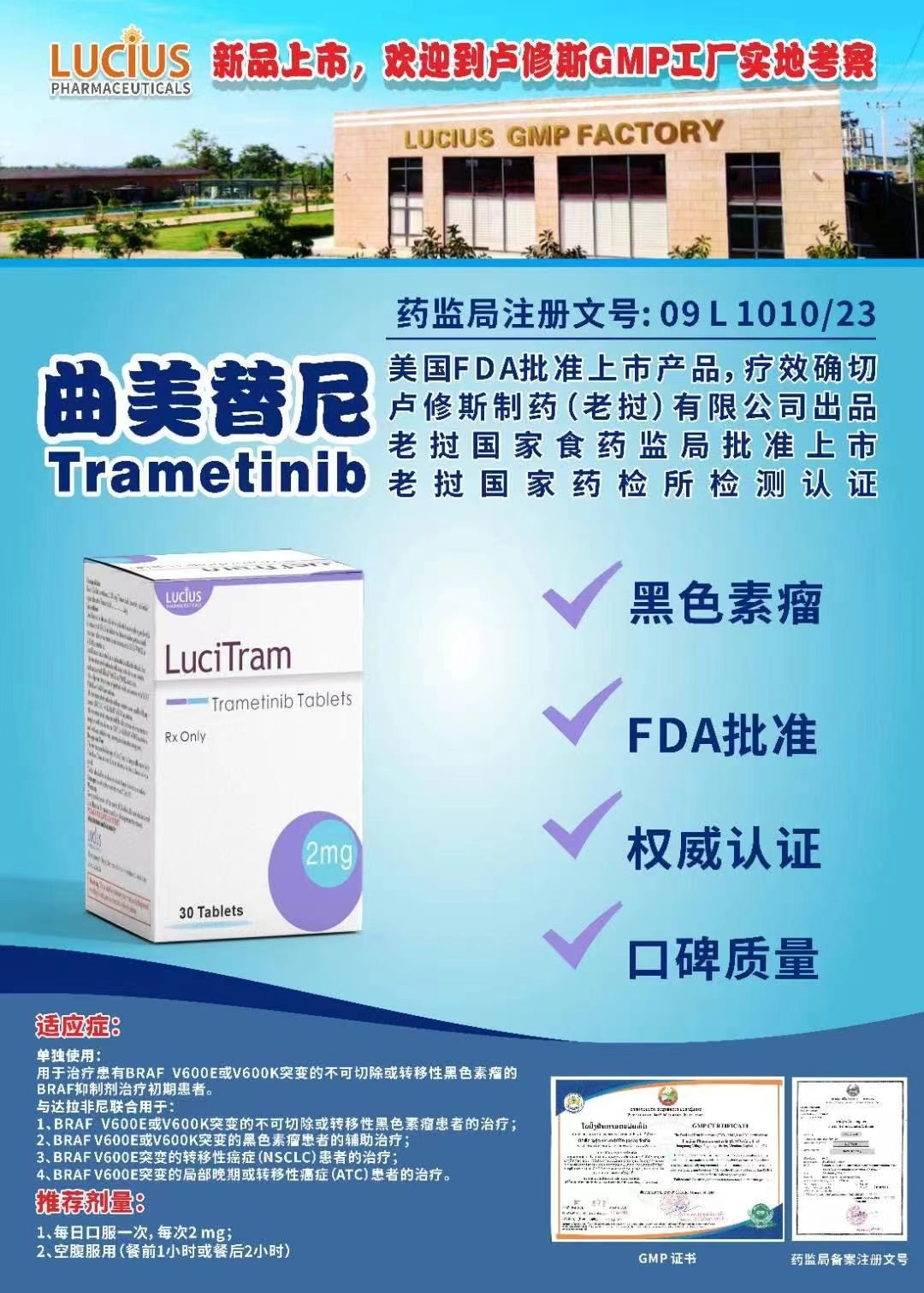 曲美替尼(Trametinib)是由美国葛兰素史克(GSK)研发,老挝卢修斯公司仿制的一种MEK抑制剂,适用于携带BRAF V600E或V600K突变的手术不可切除性黑色素瘤或转移性黑色素瘤成人患者的治疗。