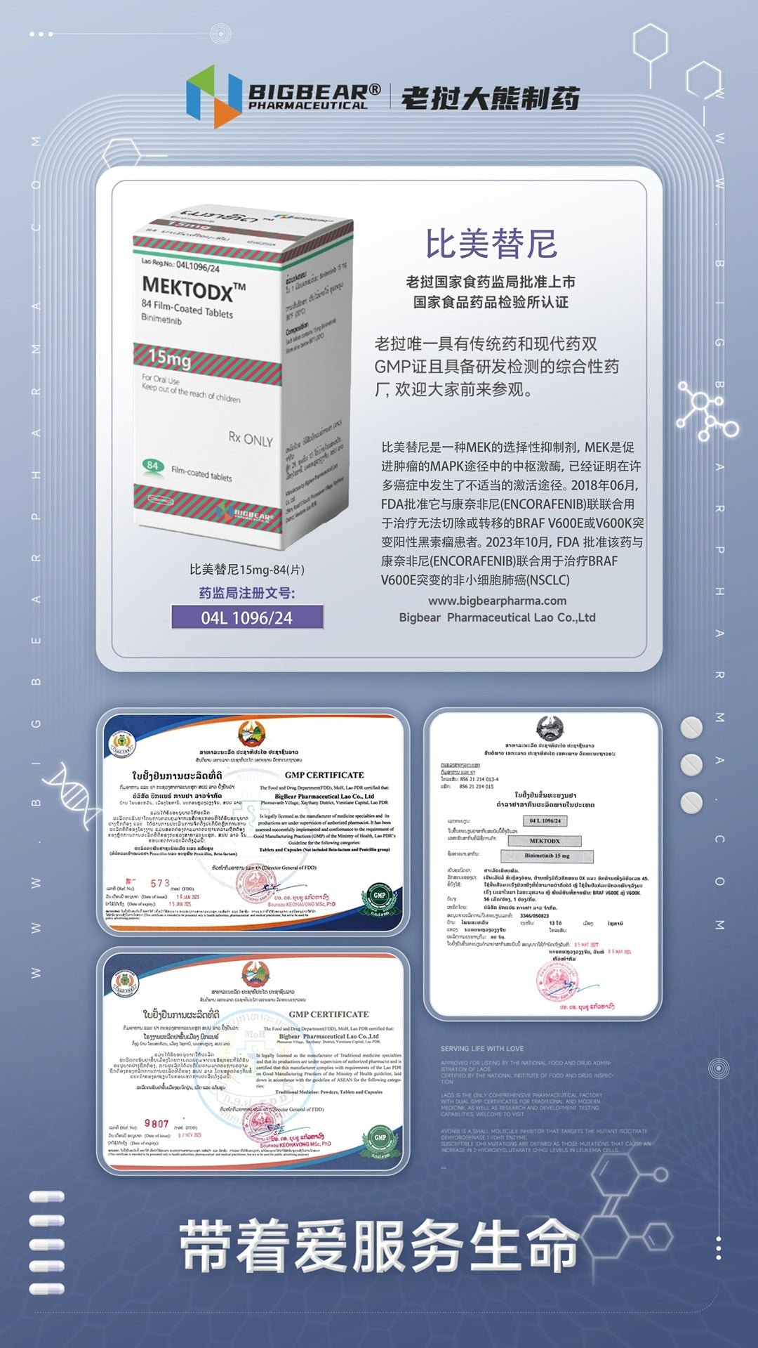 2018年06月,FDA批准它与康奈非尼(Encorafenib)联合用于治疗无法切除或转移的BRAF V600E或V600K突变剧烈的黑素瘤患者。