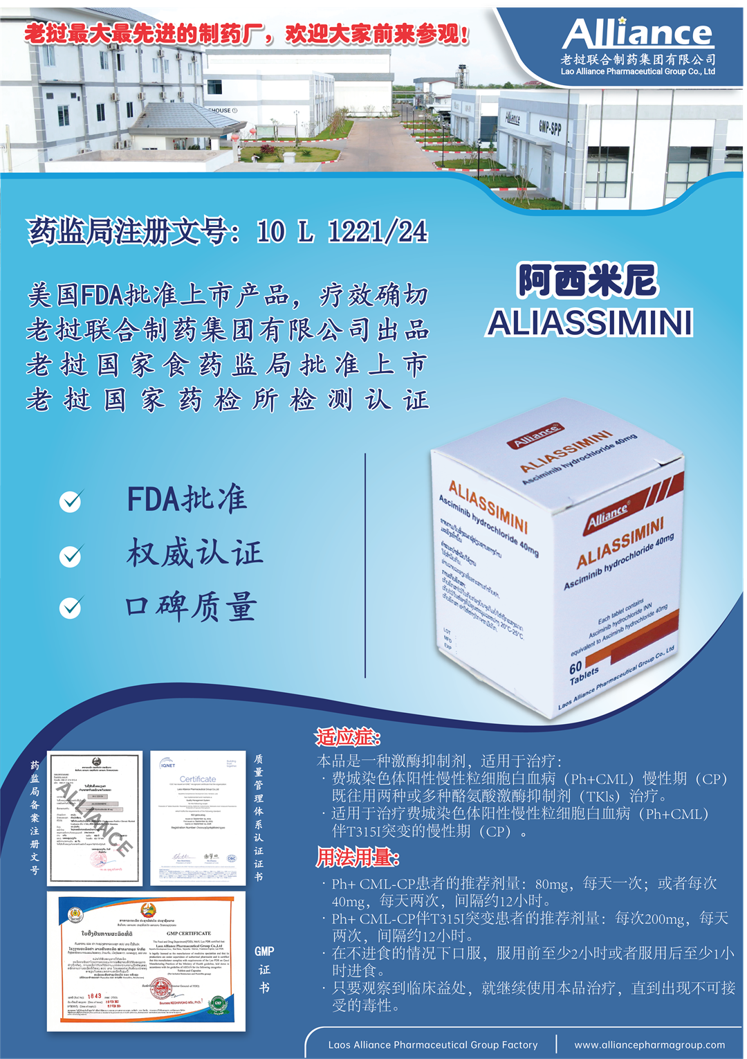 - Ph+ CML-CP患者的推荐剂量:80mg,每天一次;或者每次40mg,每天两次,间隔约12小时。