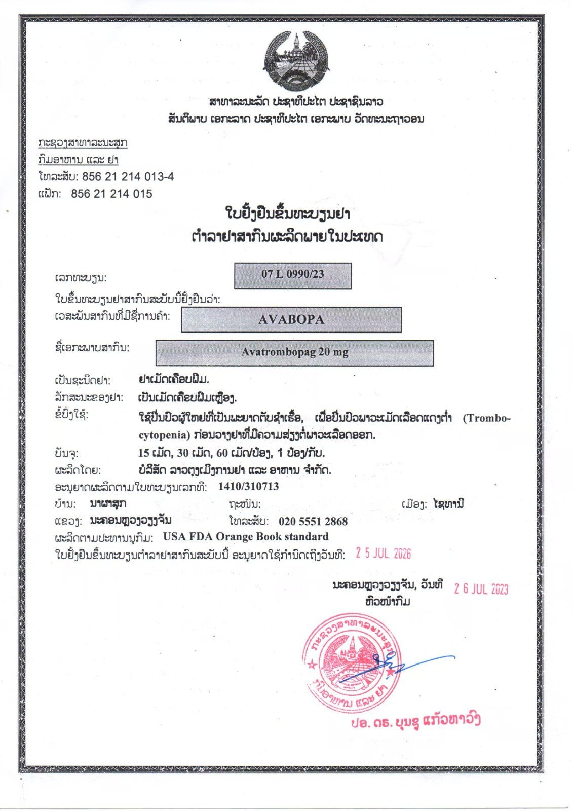 老挝东盟制药(TLPH)生产的阿伐曲泊帕(Avatrombopag)获老挝卫生部食品药品司(FDD)批准上市!该阿伐曲泊帕片商品名为Avabopa,规格为20mg/片*30片。