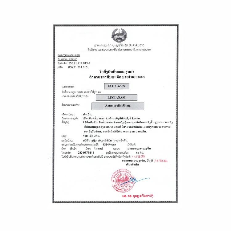 Anamorelin于2021年1月在日本获得批准。该批准主要基于在日本对癌症恶病质患者开展的2项临床研究的结果:1)在非小细胞肺癌(NSCLC)患者中开展的一项多中心、安慰剂对照、随机、双盲、平行组研究(ONO-7643-04研究);2)在结直肠癌、胃癌、胰腺癌患者中开展的一项多中心、开放标签、非对照III期研究(ONO-7643-05研究)。在这些研究中,Anamorelin在癌症患者恶病质方面显示出增加体重、肌肉质量以及食欲的作用。